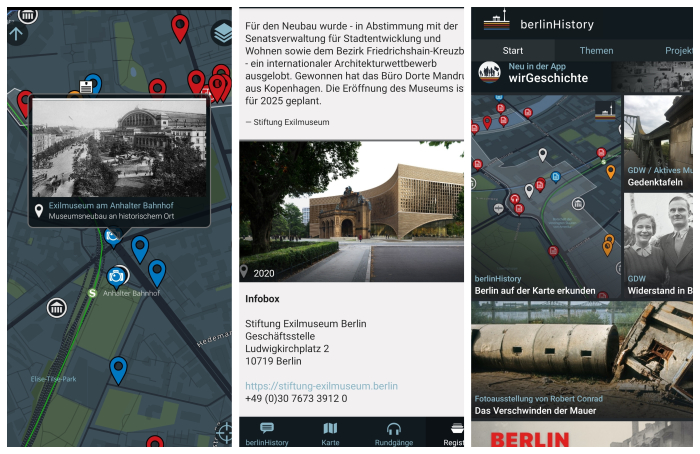 Das Exilmuseum ist nun mit Inhalten in der berlinHistory App vertreten: Mit der für den Grimme-Preis nominierten App kann man über eine interaktive Karte historische Spuren in der Stadt finden und kostenlos viele Informationen und Bilder abrufen – nun auch zur Geschichte des Anhalter Bahnhofs mitsamt den Plänen zum Exilmuseum.