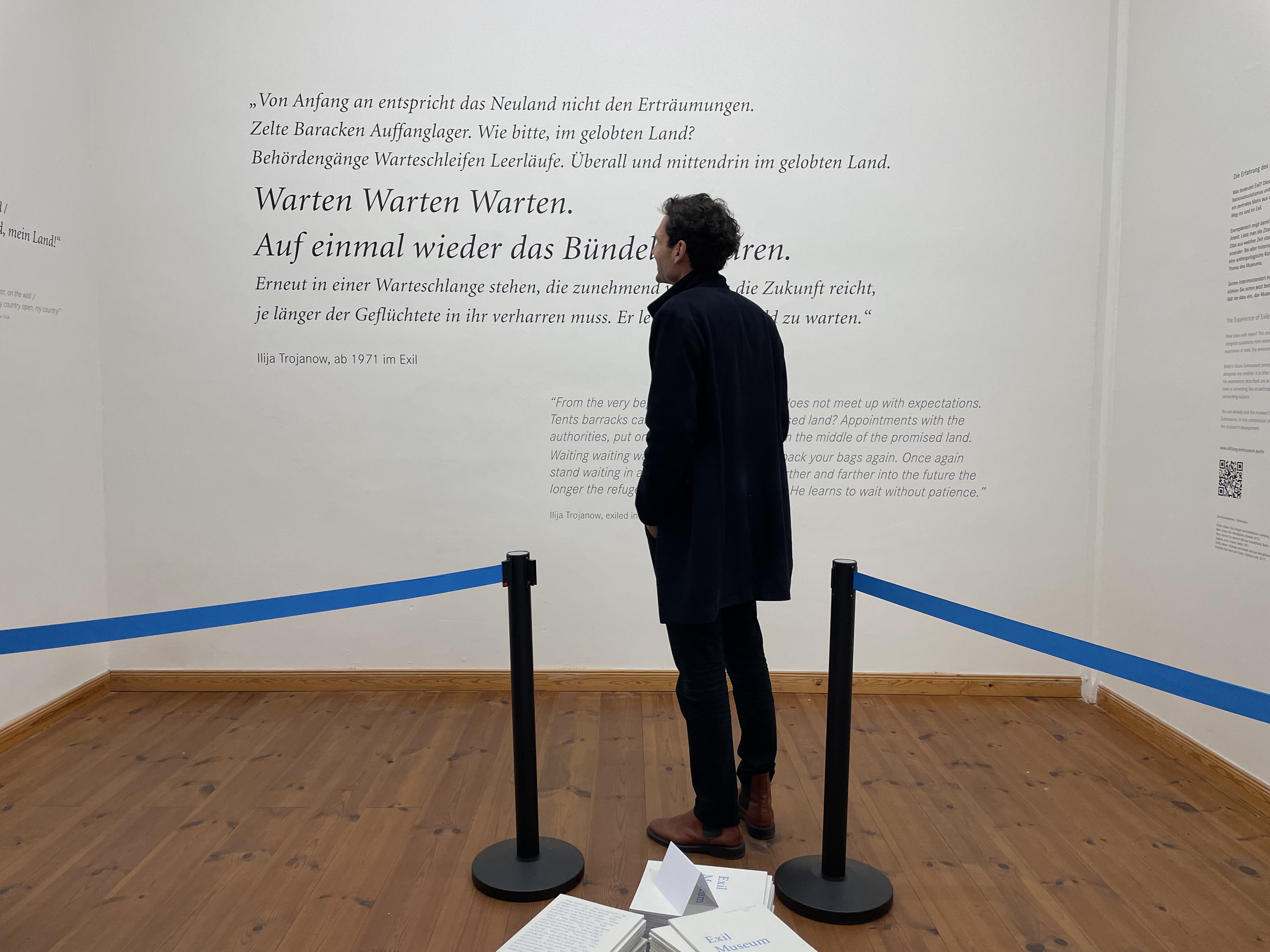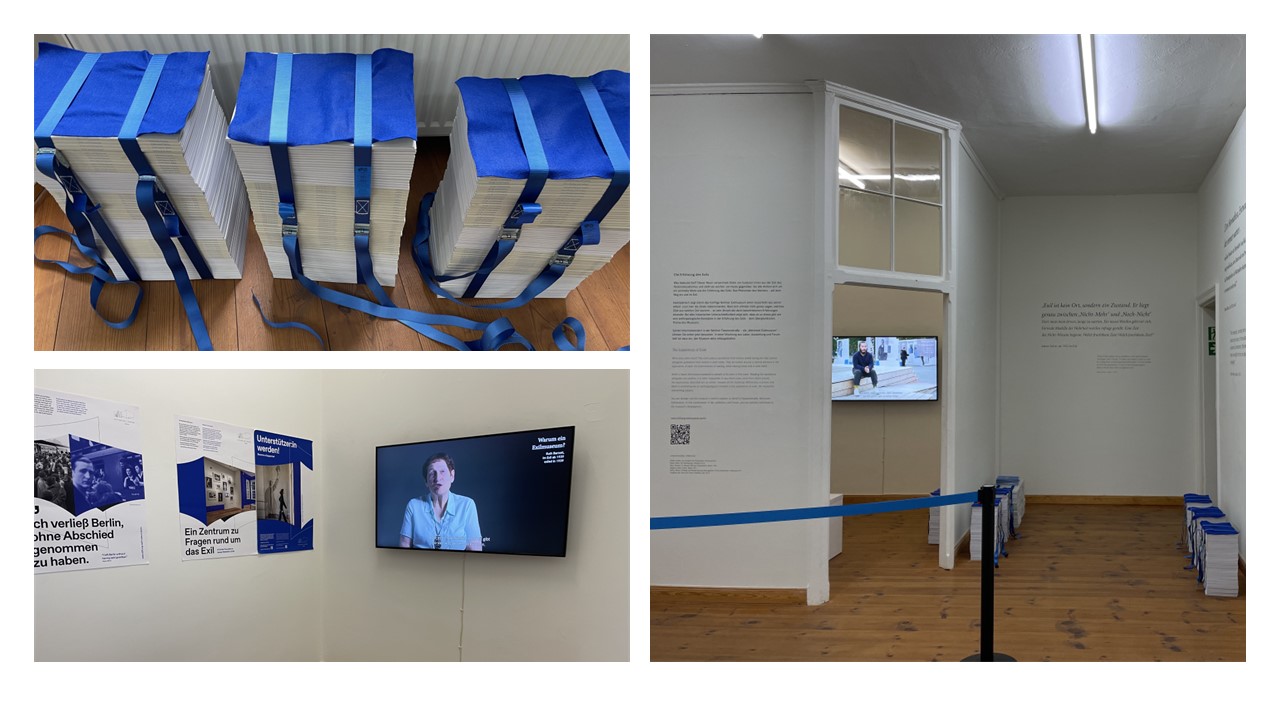 In the framework of this exhibition, Stiftung Exilmuseum was invited to design a room. In this space, we illuminate the subject of “waiting” on the way into exile and in exile using large-format quotations of authors in exile then and now. The room thus explores the approach that we will also be pursuing at Exilmuseum: making the common components of the experience of exile across history palpable. The room design takes up the motif of “waiting” with the help of barrier tapes and provisional seating in a subtle way. Posters and a film also provide information on the plans for Exilmuseum.