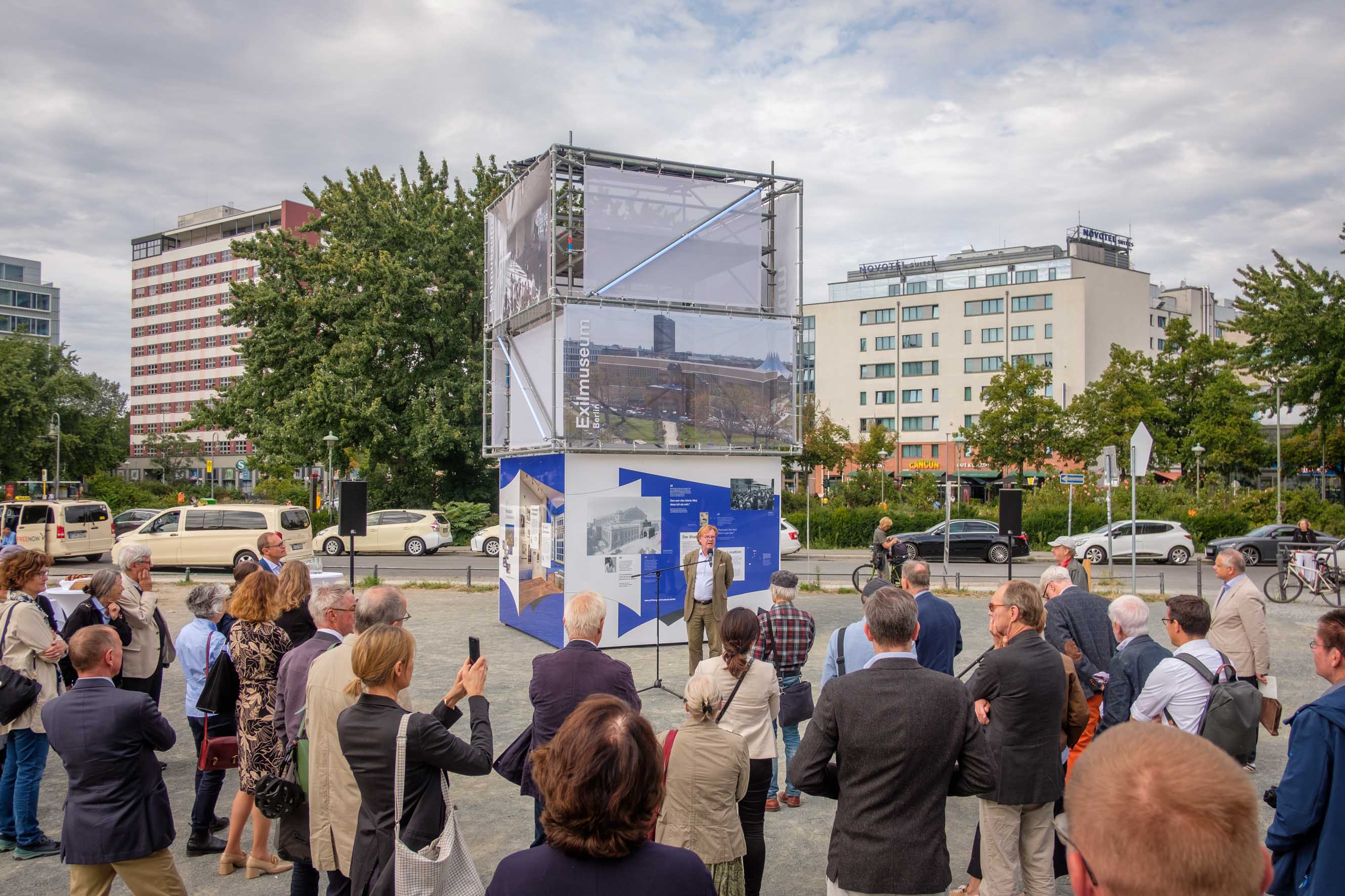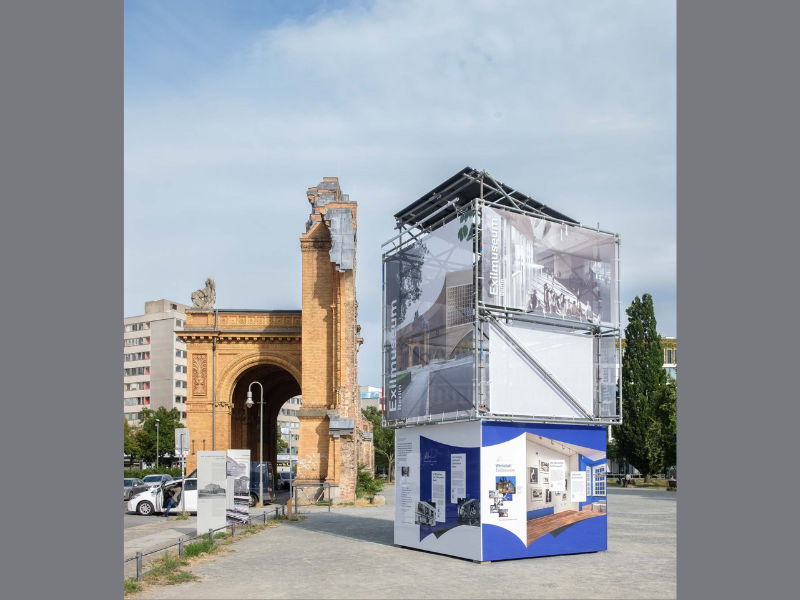 On June 21, 2023, we will be presenting a six-meter-high information tower at Anhalter Bahnhof. Visible from afar and located on the plot next to the portico ruins, it will serve to bring attention to the project in planning for the site. The tower is also intended to inform the public about Exilmuseum, encourage participation and encourage donations.